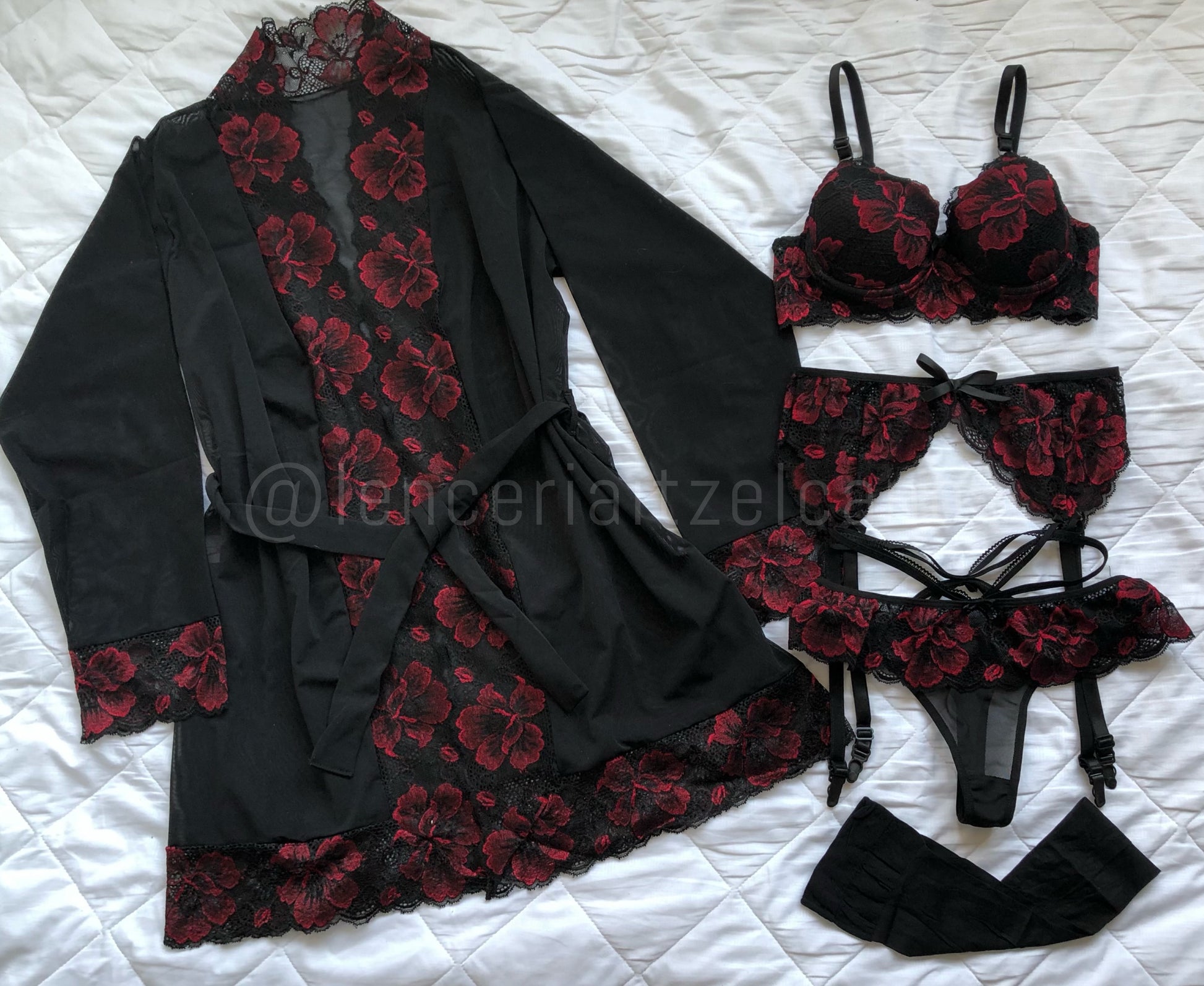 - Incluye: brassiere, liguero, tanga, media y bata