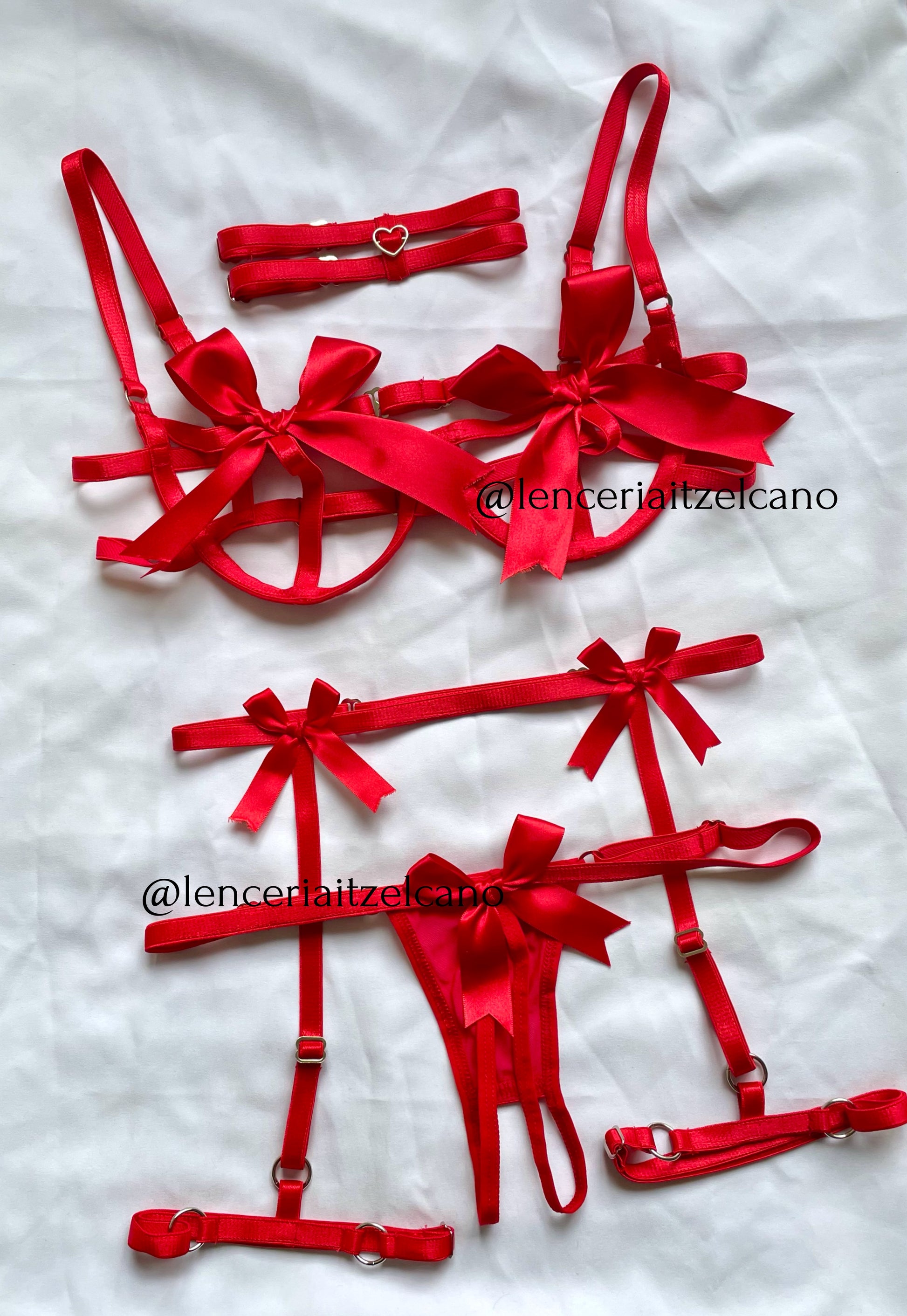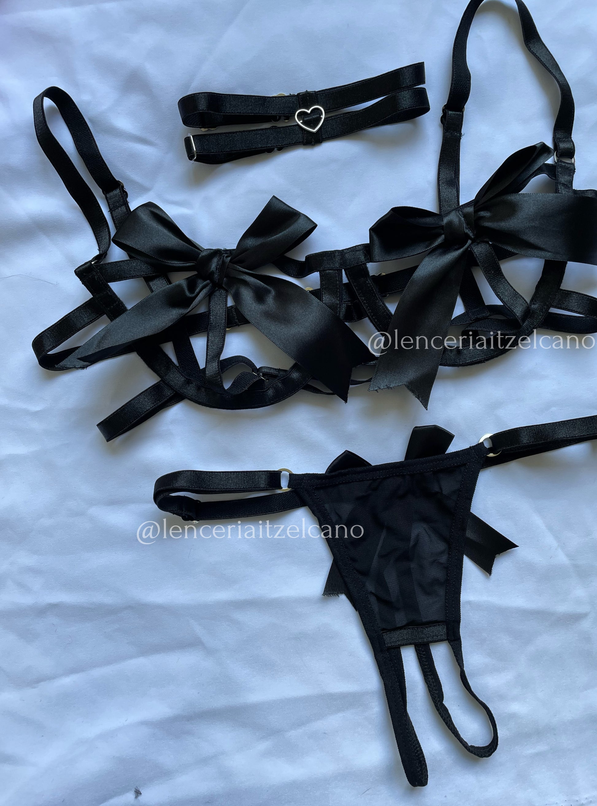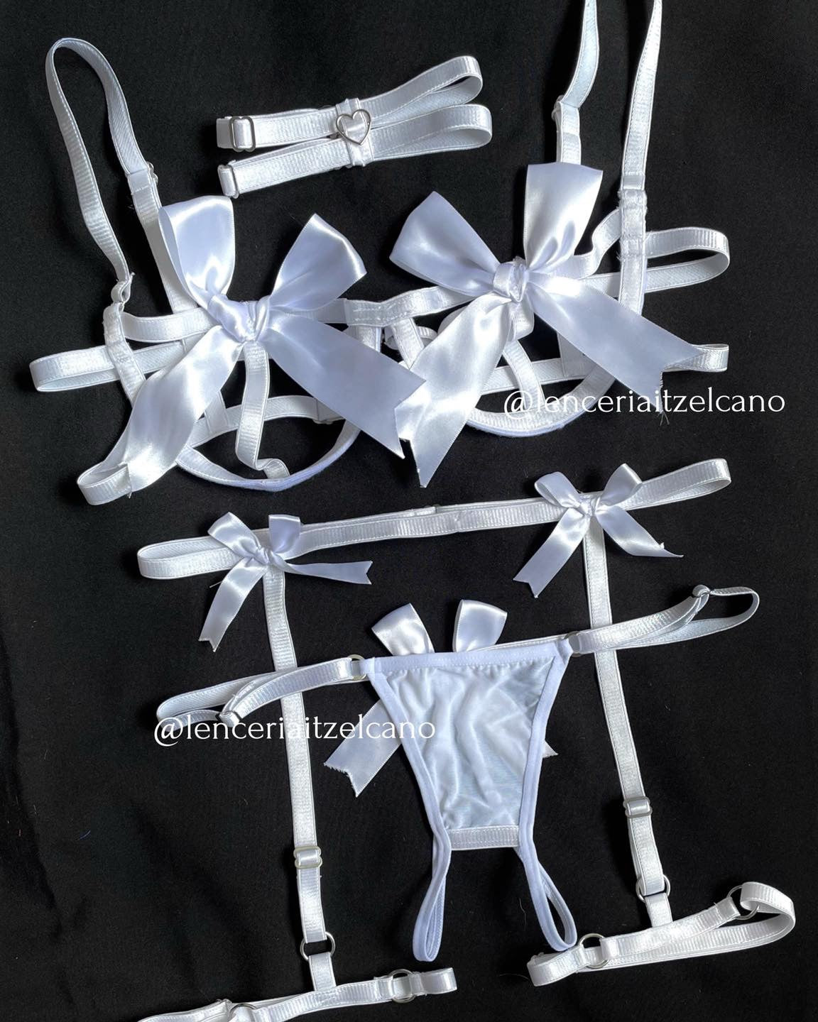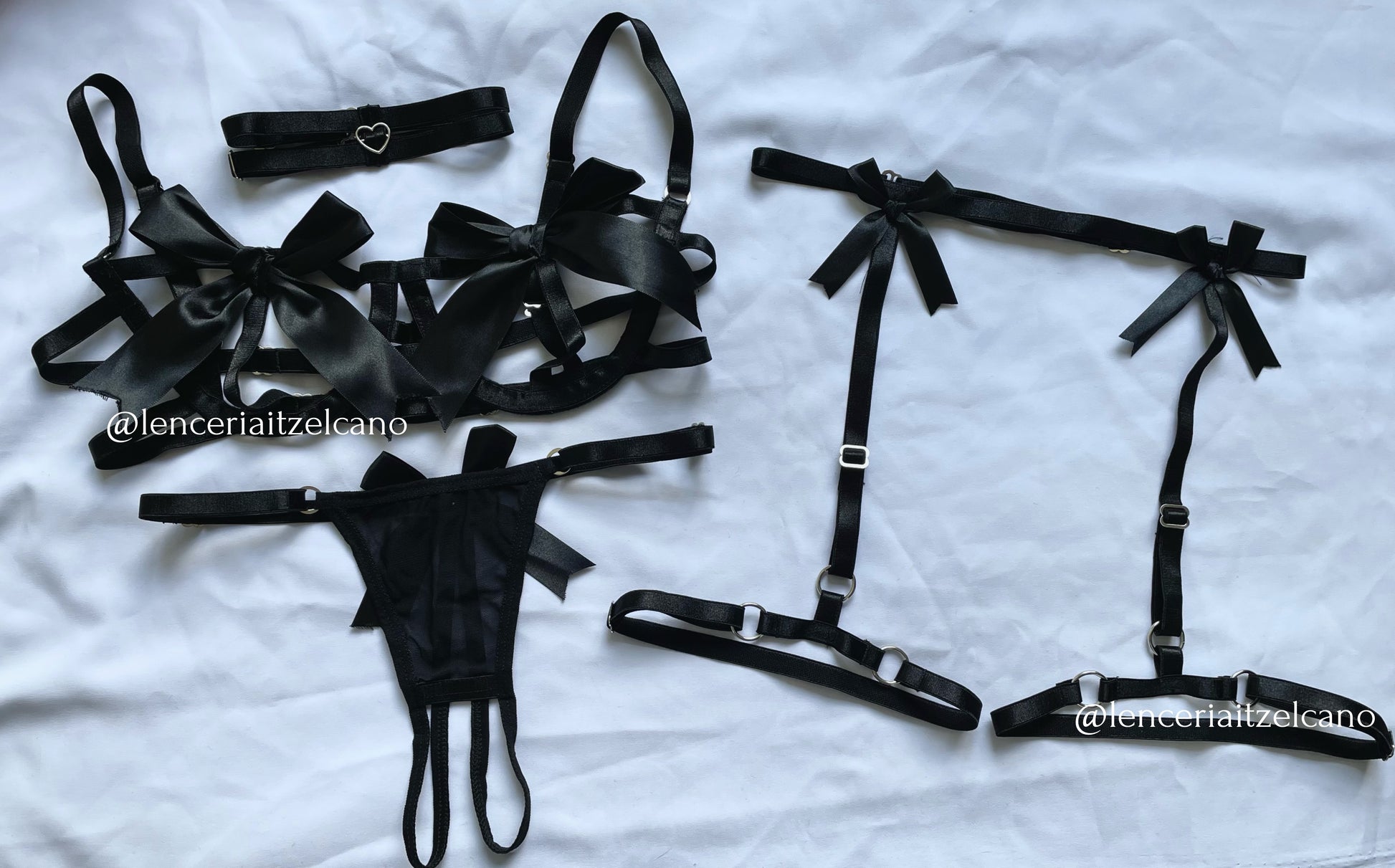 - Incluye: brassiere, liguero, tanga y gargantilla