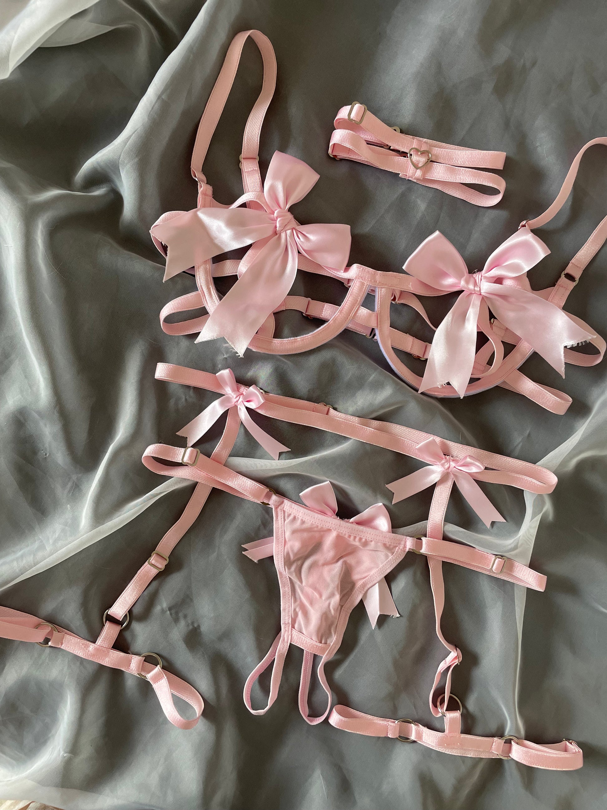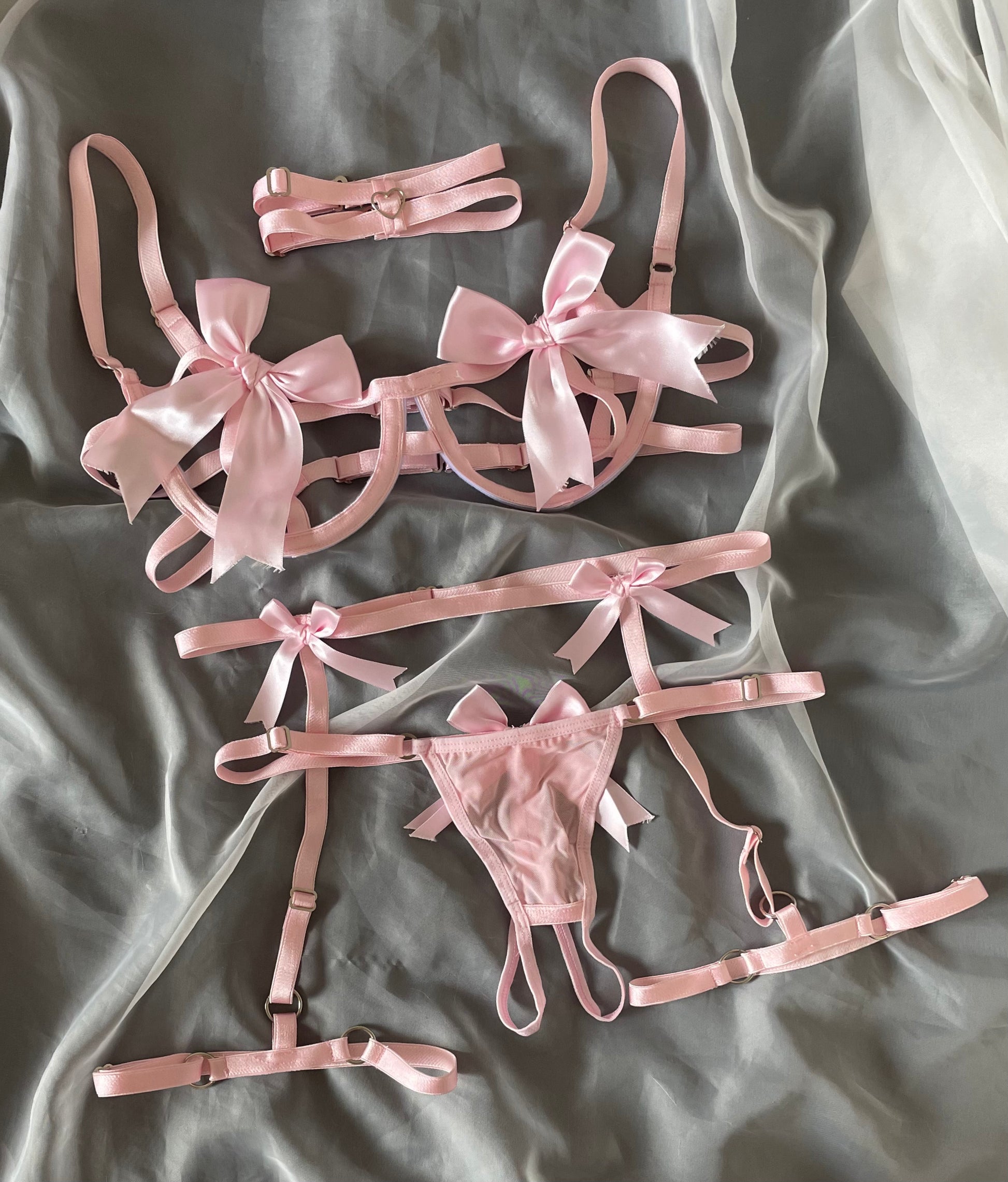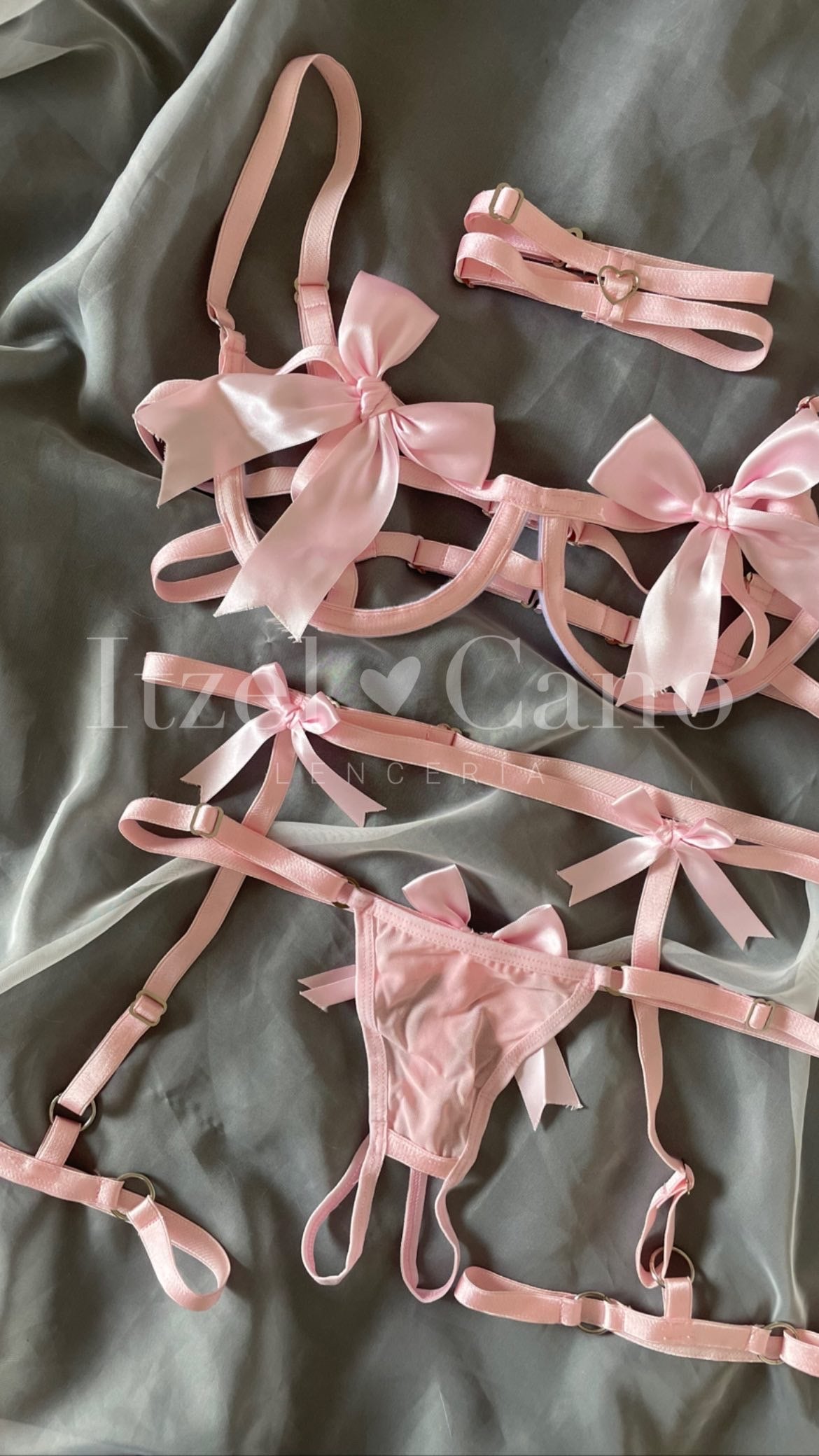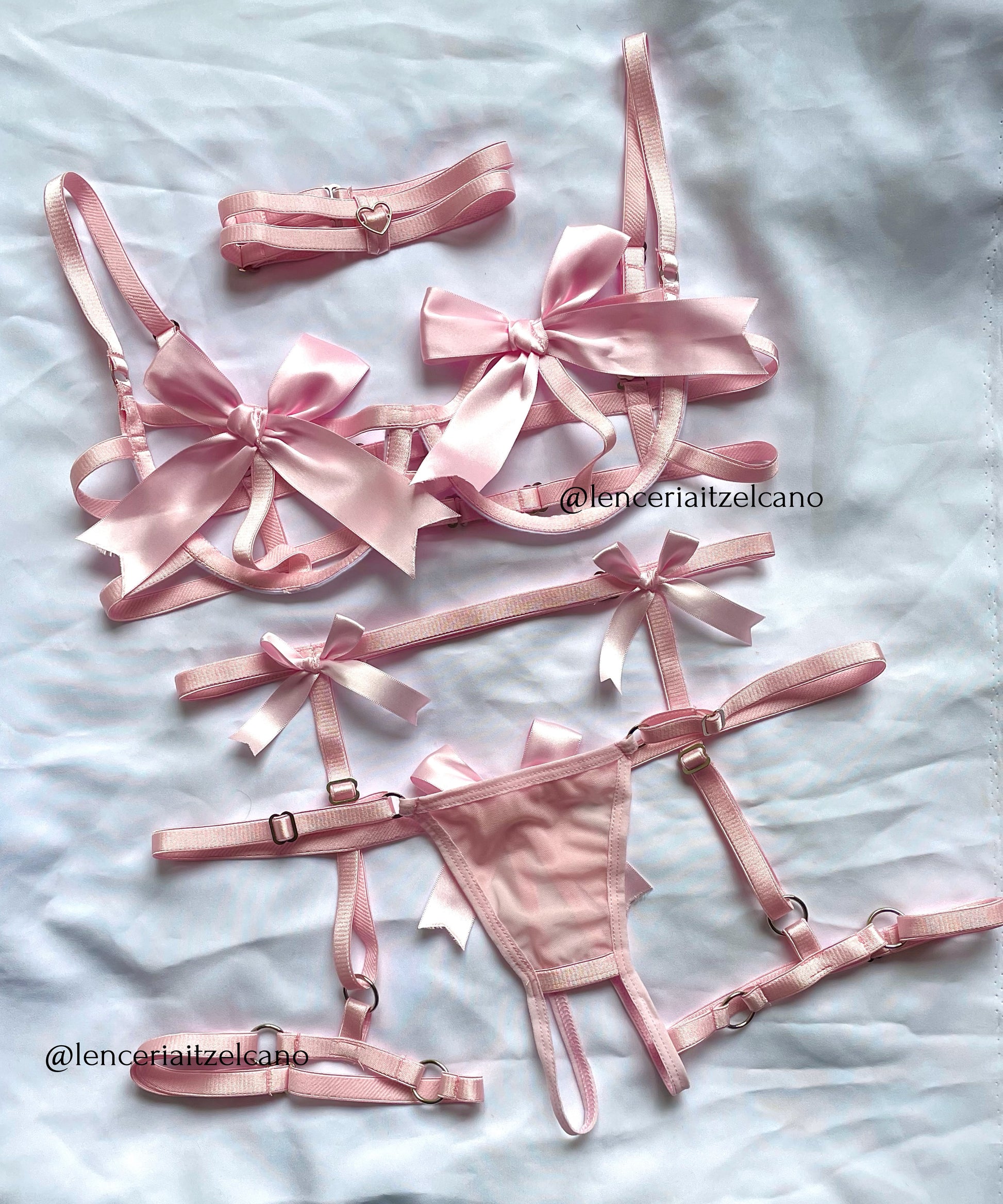 - Incluye: brassiere, liguero, tanga y gargantilla