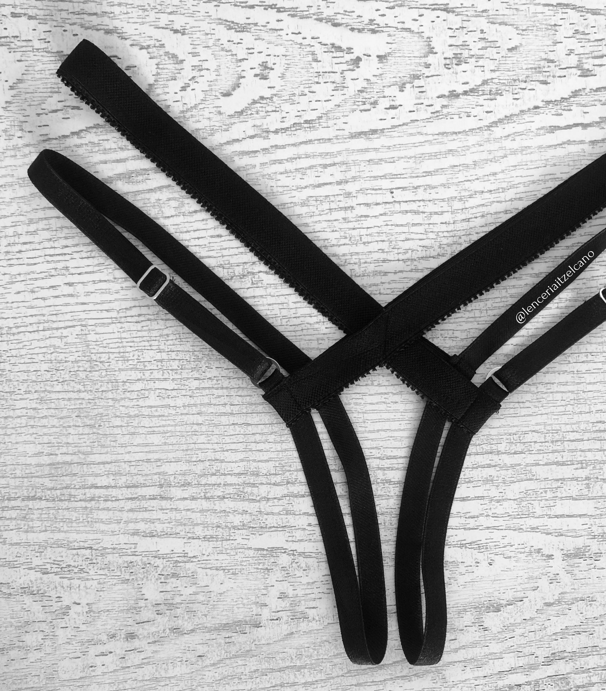 - Materiales: tanga arnés de elasticos con broches metálicos.